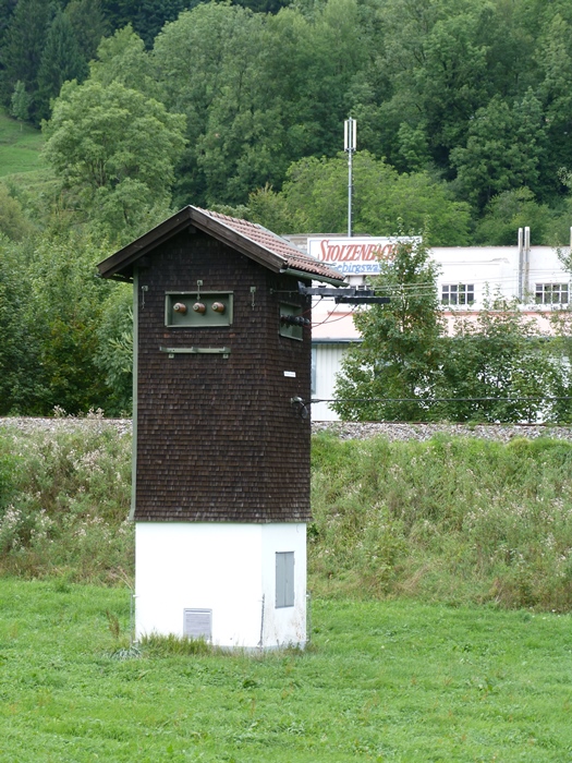 Auf der anderen Seite der Bahngleise ist die Firma Stolzenbacher Gebirgswasser in Sichtweite. Die gepflegte Turmstation