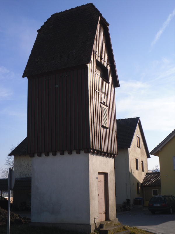 "Der Putzbau als Turm gestaltet, wie ein Teil der Stadtbefestigung wirkend. Der viereckige Grundriß im Erdgeschoß wird