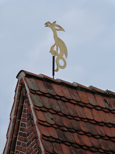Der um 1920 erbaute Backsteinturm an der Dorfstraße hat ein bibergedecktes Satteldach mit Walmdachschürze und ist