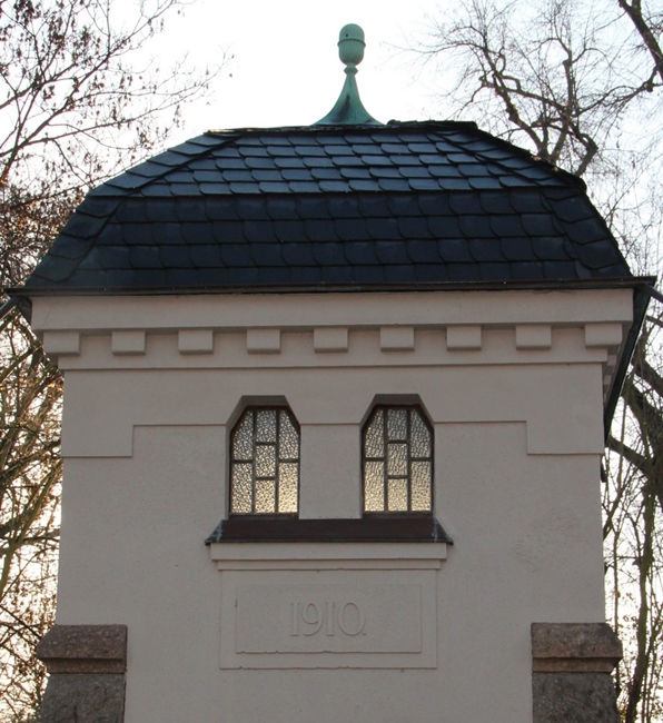 Das Türmchen ist schon sichtlich vom Zahn der Zeit angenagt. Der Wetterbeständigkeit des Natursteins und dem