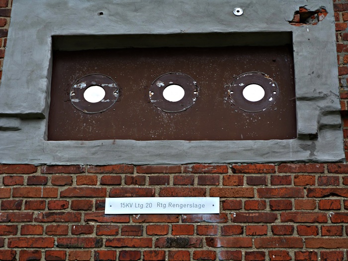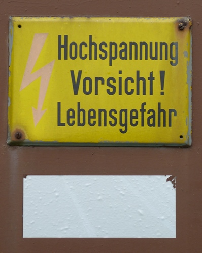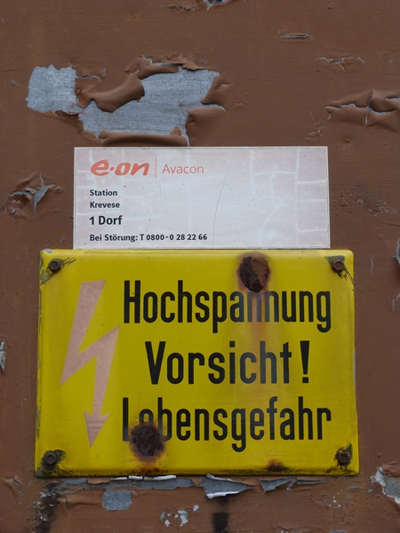 Dem Schild an der Tür entnehmen wir, dass der Trafo im Innern noch aktiv ist. Die Stromzuführung und -verteilung