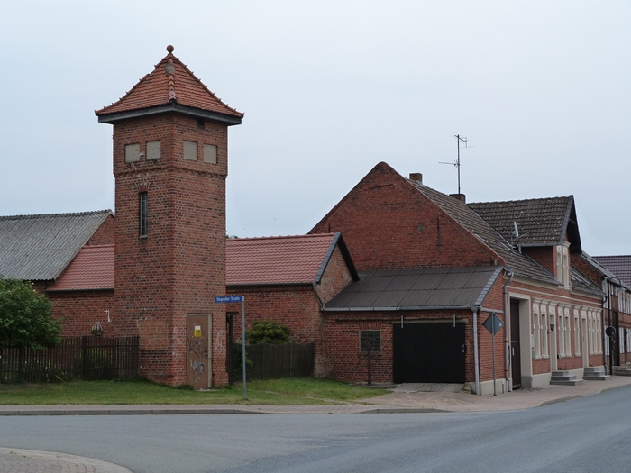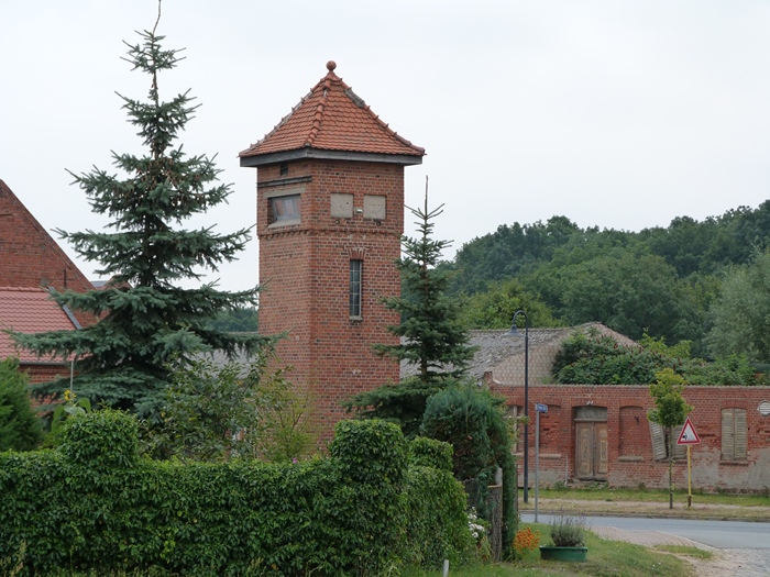 sehr schöner alter Backsteinturm, der sich in Bauweise und Standort wie aus einem Guss in das Dorf einfügt.
