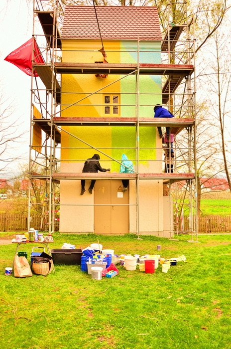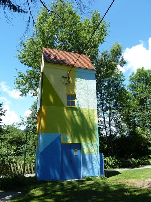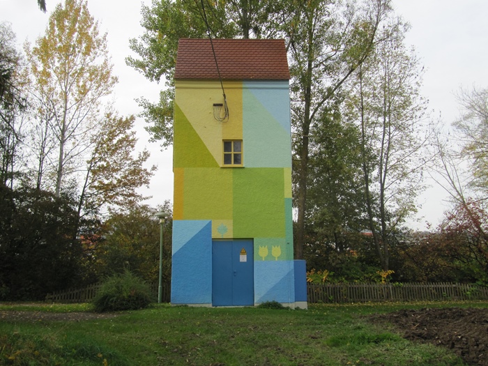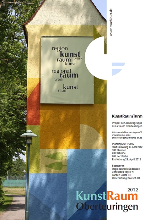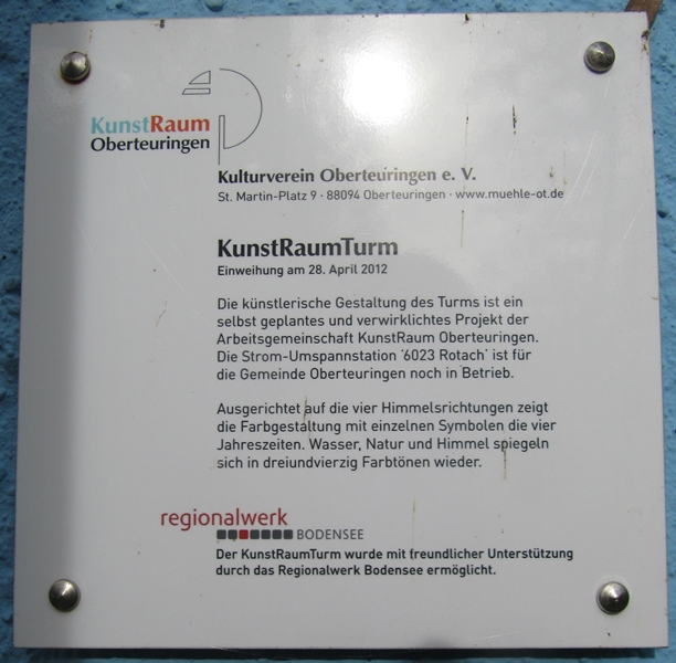 Diese Webseite wurde mit Stand Mai 2016 eingestellt [ weiterlesen ] Zu Oberteuringen gehören u.a. auch die Ortschaften Bitzenhofen, Hefigkofen, Neuhaus, Rammetshofen und Remette. ![]() ![]() ![]() Der Trafoturm vorher ![]() ![]() ![]() ![]() ![]() ![]() making of ![]() ![]() ![]() ![]() ![]() ![]() ![]() ![]() ![]() ![]() ![]() ![]() ![]() ![]() ![]() ![]() ![]() ![]() ![]() Der fertige KunstRaumTurm Fotos: Angela Schneider und Bruno Rauscher, 2012 Fotos zweitunterste Reihe: Friedbert Kowalsky, 2012 Fotos unterste Reihe: Wolfgang Radau, 25. Oktober 2013 Die idyllisch an der Rotach gelegene "Umspannstation 6023 Rotach" des Regionalwerks Bodensee wurde im April 2012 vom KunstRaum Oberteuringen zum farbenfrohen Kunstwerk umgestaltet. KunstRaum Oberteuringen ist ein Projekt der Arbeitsgruppe Kultur in der Mühle und Künstlern aus der Region. In der zweiten Bildreihe ist das making of des KunstRaumTurms zu sehen: Zunächst wurde die Farbgestaltung wie ein Schnittbogen am PC entwickelt und maßstabsgetreu auf den Fassaden des fast 10 Meter hohen Baus vorgezeichnet. Auch die Farbtöne wurden am PC gemischt und dann beim Farbenhändler nach dessen Palette ausgesucht. In einer Präsentation (PDF 3,3 MB) wurde das Projekt in Fotomontagen dem Sponsor vorgestellt. Anschließend wurde der Turm nach der Isolierung und Sicherung der elektrischen Leitungen von einem Gerüst umgeben und von den KünstlerInnen bemalt. Wegen dem rauen Putz (ca. 2 cm Körnung) kamen bei der Bemalung langflorige Borstenpinsel zum Einsatz: hier war echte Handarbeit angesagt. Der Energieversorger Regionalwerk Bodensee übernahm die Kosten der Kunstaktion und brachte die Trafostation auf den neuesten Stand der Technik: statt Abriss und Ersatz durch eine moderne Fertigbetonstation wurde hier erfreulicherweise das gute alte Trafohäuschen erhalten und saniert. Von den früheren Freileitungen war vor der Renovierung noch eine Niederspannungsleitung in Betrieb (siehe Bilder der obersten Reihe). Diese wurde durch ein isoliertes sogenanntes Schwedenkabel ersetzt, ungefährlich für Mensch und Tier. Alle anderen Leitungen waren bereits auf Erdkabel umgestellt. Jetzt versorgt die Umspannstation nicht mehr nur die Anwohner zuverlässig mit Strom, sondern erfreut mit ihrer Farbenpracht auch Spaziergänger, Radler und Kunstfreunde. Weitere Infos zur Entstehung des Kunstobjekts gibt es auf der Webseite KunstRaum Turm der Kulturmühle. Am 2. Mai 2012 schrieb Christel Voith in der Schwäbischen Zeitung über die Enthüllung des Kunstwerks am 28. April: "Einfach toll, was ehrenamtliches Engagement zu bewegen vermag! Drei Monate Planung, dann an dreizehn Tagen bei lausiger Kälte mit neun Helfern in 300 Stunden ca. 130 qm Putz mit 70 kg Farbe in 43 Farbtönen bemalt. Das umreißt in dürren Zahlen, was die Arbeitsgemeinschaft KunstRaum in Oberteuringen mit ihrer unermüdlichen "Chefin", der Künstlerin Barbara Kensy-Schneider, geleistet hat, bis am Samstagnachmittag bei strahlendem Sonnenschein der völlig verwandelte "KunstRaumTurm" gegenüber der Mühle enthüllt werden konnte. (...) Wie Kensy-Schneider vorher in der Mühle erzählte, hätte der Arbeitskreis die Umspannstation neben der Rotach schon lange gern in ein künstlerisches Schmuckstück verwandelt, doch sah er keine Möglichkeit zur Finanzierung. Als das Regionalwerk Bodensee der neue Besitzer wurde, reichte die ARGE-KunstRaum ihre Idee als Aktion Bürgersinn 2011 ein und bekam mit tatkräftiger Rückendeckung durch Bürgermeister Karl-Heinz Beck die Zusage, dass das Regionalwerk die Kosten übernehmen werde. Kensy-Schneider berichtete von den Ideen der Grundschulklasse 4b der Teuringer-Tal-Schule, von der Grundidee der vier Jahreszeiten, die dann in Farbfeldern umgesetzt wurde. Farben, wie auch symbolische Zeichen wie stilisierte Tulpen, Bäume, Herbstblätter und Eiskristalle stehen für die Jahreszeiten, die sich um die vier Seiten des Turmes ziehen. Farben, die leuchten, erst recht an diesem sonnigen Nachmittag, wo die Südseite den Gästen herrlich warm entgegenstrahlt. Bürgermeister Beck dankte dem Regionalwerk, das dem Projekt zugestimmt hat und es finanziert, wie auch dem Kunstteam, insbesondere dem Malteam. Wie Irmgard Dollansky sagte, war Barbara Kensy-Schneider zusammen mit ihrer Tochter Angela die treibende Kraft, sodass sie im Kunstteam vom "Barbara-Turm" sprechen würden. Hausherr Dieter Sautter freute sich über den "farbenfrohen Hingucker": "Das Projekt macht uns stolz und ist auch für uns ein Pilotprojekt." Wie Bürgermeister Beck sagte, ist der Turm gemeinsam mit der Tulpe jetzt das Entrée zum Oberteuringer Kunstpfad. (...)" Weitere Beispiele solcher Kunstprojekte an Trafohäuschen präsentieren wir auf unserer Seite Wandmalerei, Graffiti, Illusionsmalerei.