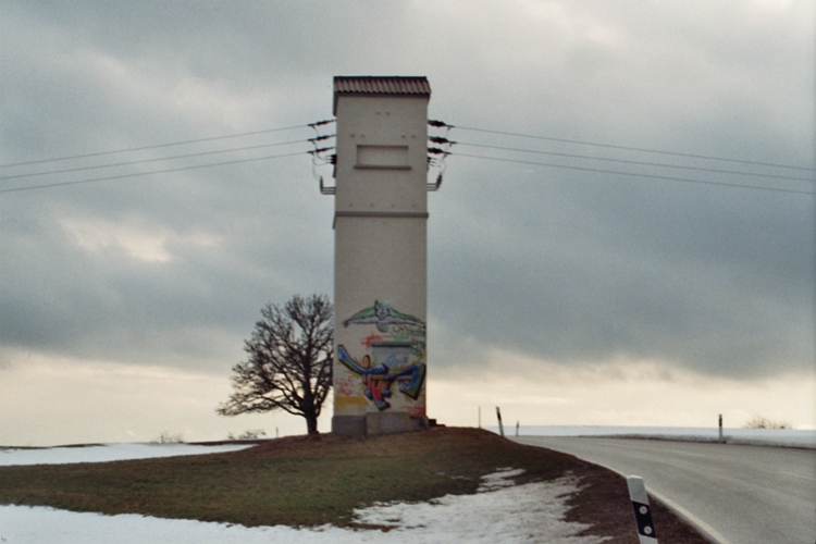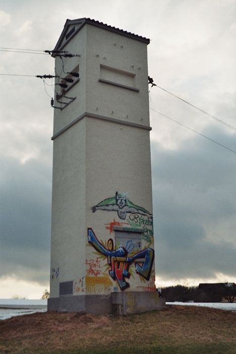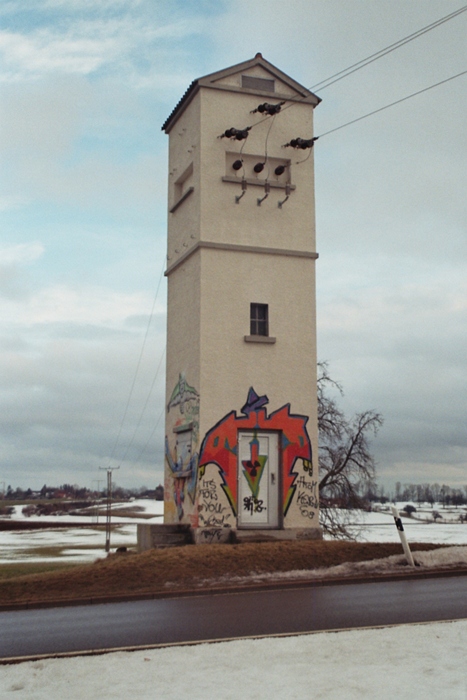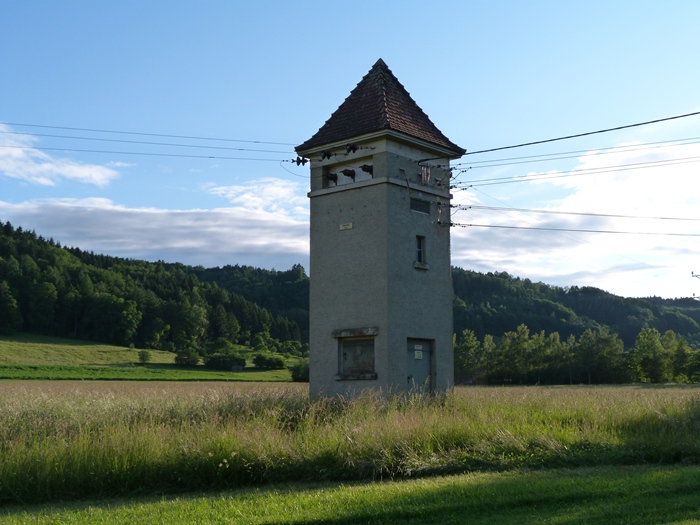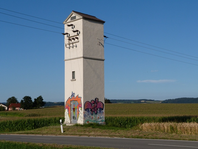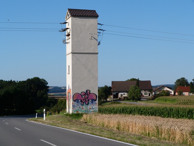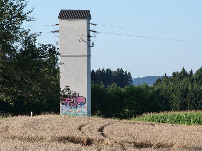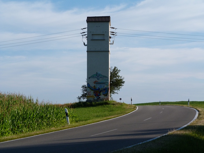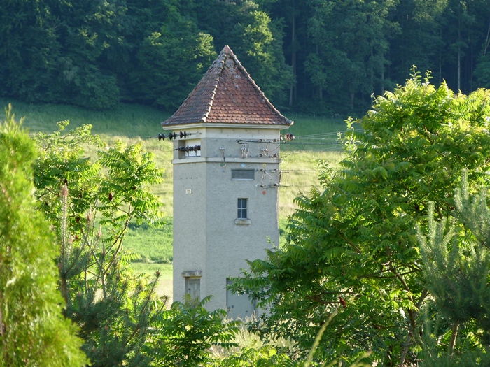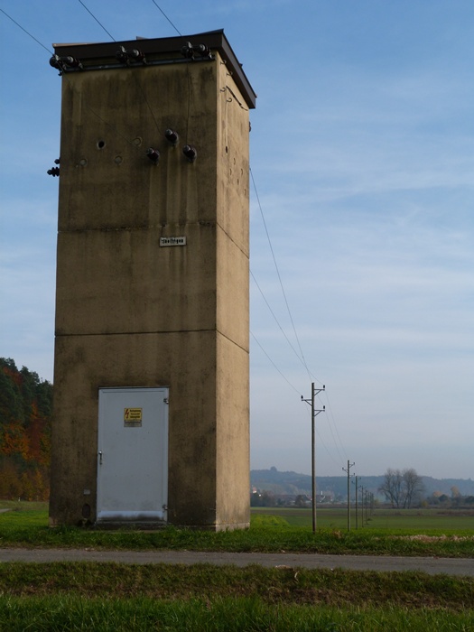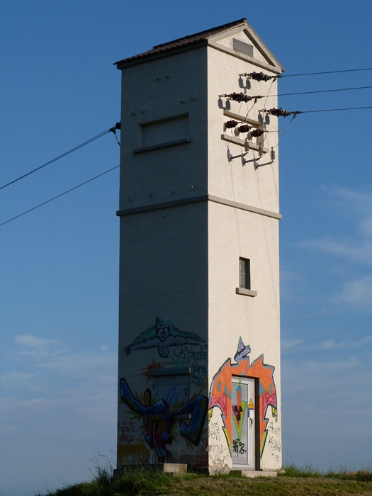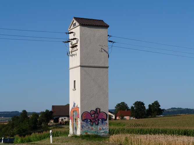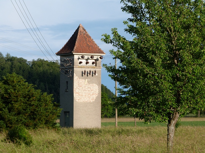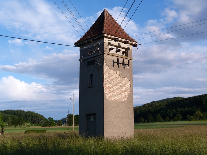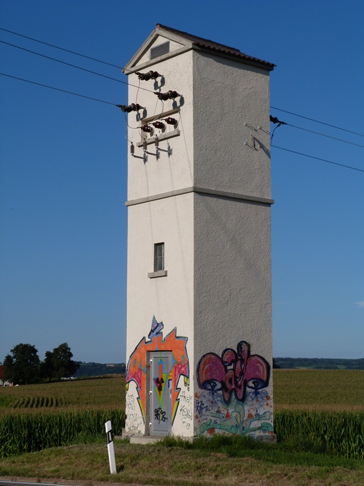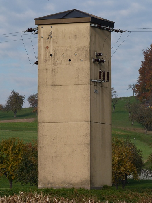Der höchstgelegene Trafoturm des Linzgaus steht an der Straße von Taisersdorf nach Owingen, von Taisersdorf kommend