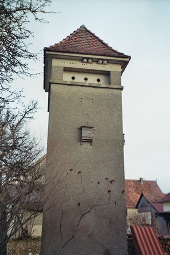 Der schöne alte Turm mit biberschwanzgedecktem Pyramidendach steht idyllisch im zauberhaften Billafinger Tal, am