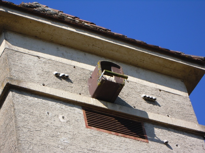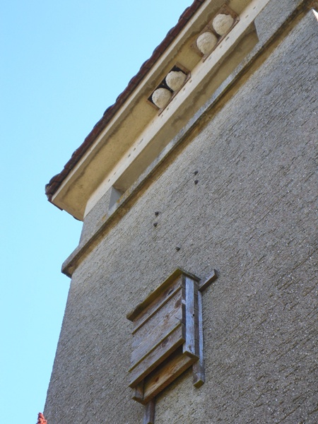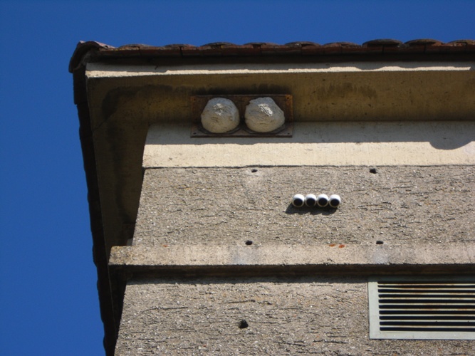 Jedenfalls sind unter dem Dach Schwalbennester zu sehen und an den Wänden unterschiedliche Nistbehälter für