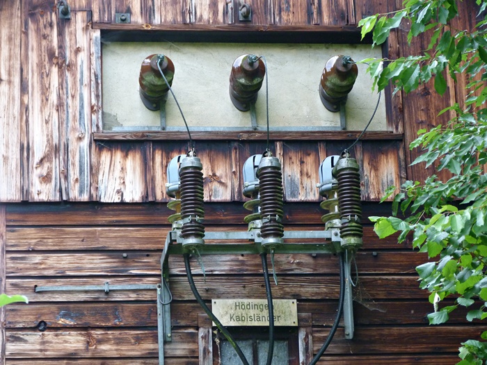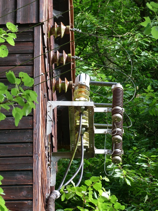 Die blanken Mittelspannungsdrähte zwischen dem Kabel und den Wanddurchführungen sind mit Vogelschutz-Armaturen isoliert.