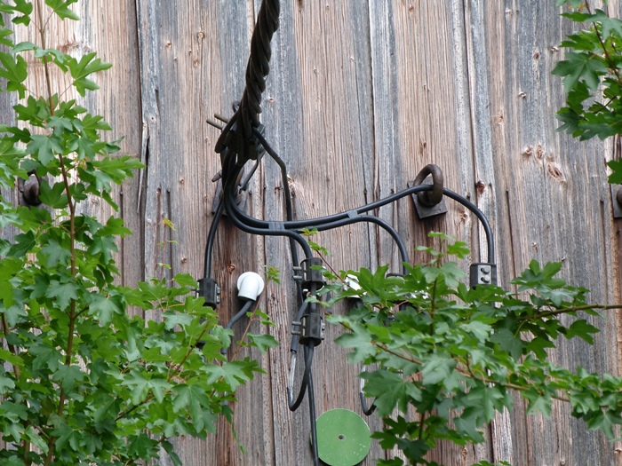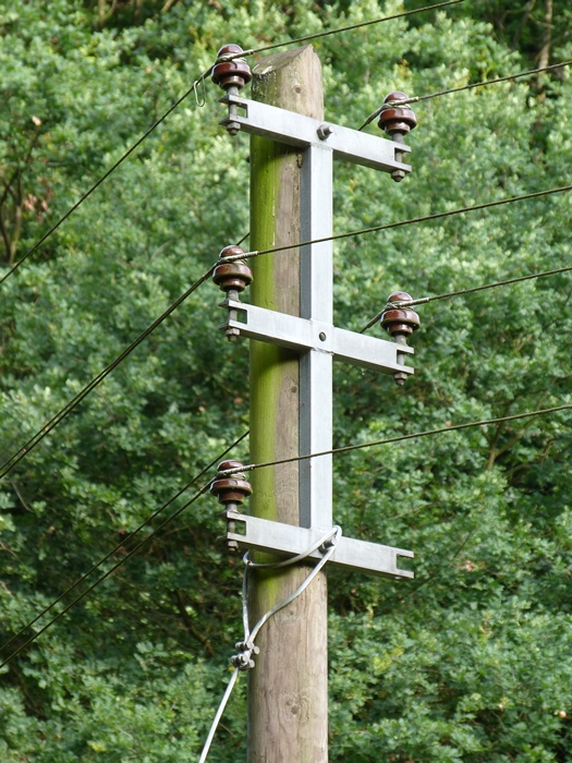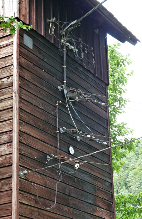 Hier sehen wir die Niederspannungsabgänge am Turm. Teilweise werden die Haushalte von hier noch über klassische Freileitungen versorgt, teilweise schon über moderne isolierte Schwedenkabel (Fotos rechts).