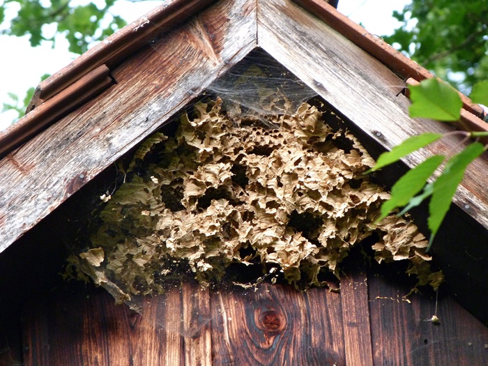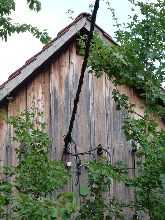 Umspannstation Suessenmuehle 51 Das nebenstehende Foto zeigt ein weiteres interessantes Detail: ein großes verlassenes Hornissennest am Turmgiebel. Ein Hornissenvolk (Vespa crabro) kann bis zu einer Größe von 400 bis 700 Tieren anwachsen. Die Nester werden nur eine Saison lang bewohnt und von den Königinnen nach der Überwinterung im nächsten Frühjahr neu angelegt. Hornissen stehen unter Naturschutz.