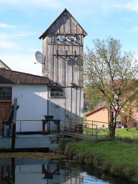 Die Lage des Turms direkt am Stauwehr erklärt auch die ungewöhnliche Bauweise "auf Stelzen".