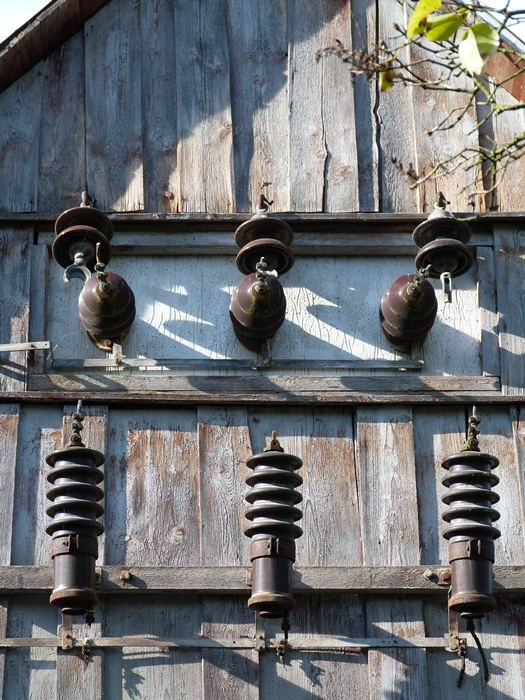Daran hat man dann Isoliereier als Abspannmöglichkeit für die Leitungsseile gehängt