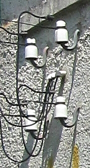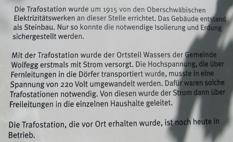 im Bauernhaus-Museum Wolfegg Diese Webseite wurde mit Stand Mai 2016 eingestellt [ weiterlesen ] ![]() ![]() ![]() ![]() ![]() ![]() ![]() ![]() ![]() ![]() ![]() ![]() ![]() ![]() ![]() Die Trafostation Wassers von 1915 im Bauernhaus-Museum Wolfegg Fotos: Wolfgang Radau, 6. August 2013 untere Reihe: mit freundlicher Genehmigung des © Bauernhaus-Museums Wolfegg Der Trafoturm in Wolfegg wurde nicht ins Museum umgesetzt, sondern steht seit 1915 immer noch an seinem ursprünglichen Ort im Wolfegger Ortsteil Wassers und ist sogar heute noch in Betrieb. Er wurde damals errichtet, um das Dorf Wassers mit Strom zu versorgen. Man kann davon ausgehen, dass der Transformator im Innern wie überhaupt die ganze elektrische Anlage nicht mehr im Zustand von 1915 ist, sondern im Lauf der Zeit erneuert und den modernen Erfordernissen angepasst wurde. Dies gilt auch für einen Teil der sichtbaren Isolatoren außen an den Turmfassaden und der ebenfalls sichtbaren Niederspannungs-Freileitungen zur Versorgung der Haushalte. Die Detailabbildung oben rechts zeigt vier Isolatoren des Reichspostmodells in Größe 1. Diese könnten noch die Originalbestückung sein. Sie finden sich wieder auf dem gegenüber gelegenen Dachständeranschluss. Auf der gegenüber liegenden Turmwand gehen mehrere moderne Niederspannungs-Kreise an Isoliereiern abgespannt zu den Häusern. Auch Erdkabelabgänge im Niederspannungsnetz sind an den Schaltkästen neben der Turmwand erkennbar. Die Mittelspannung wird offensichtlich in der Zwischenzeit per Erdkabel eingeführt. Text der links unten abgebildeten Infotafel aus dem Museum: "Die Trafostation wurde um 1915 von den Oberschwäbischen Elektrizitätswerken an dieser Stelle errichtet. Das Gebäude entstand als Steinbau. Nur so konnte die notwendige Isolierung und Erdung sichergestellt werden. Mit der Trafostation wurde der Ortsteil Wassers der Gemeinde Wolfegg erstmals mit Strom versorgt. Die Hochspannung, die über Fernleitungen in die Dörfer transportiert wurde, musste in eine Spannung von 220 Volt umgewandelt werden. Dafür waren solche Trafostationen notwendig. Von diesen wurde der Strom dann über Freileitungen in die einzelnen Haushalte geleitet. Die Trafostation, die vor Ort erhalten wurde, ist noch heute in Betrieb." ![]() ![]() ![]() ![]() Jettkofen 1915 Kürnbach 1918 Bolstern 1914 Ebersbach 1914 Den Bautyp des Trafohäuschens aus den 1910er Jahren, der von den damaligen Oberschwäbischen Elektrizitätswerken damals öfter eingesetzt wurde, konnten wir bereits in mehreren Exemplaren dokumentieren: Die Turm-Umspannstation Wildes Ried von 1918 beispielsweise steht im Oberschwäbischen Museumsdorf Kürnbach im benachbarten Landkreis Biberach. Der Kürnbacher Turm wurde allerdings in das Museum umgesetzt, ist nicht mehr in Betrieb und steht den Museumsbesuchern mitsamt der historischen Inneneinrichtung offen. Weitere Stationen aus den Jahren 1914 und 1915 (und immer noch in Betrieb) haben wir in Jettkofen, Bolstern und Ebersbach entdeckt - allesamt Dokumente der Elektrifizierung Oberschwaben in der Zeit des ersten Weltkriegs. Wie diese gehört auch die Trafostation Wolfegg zu unseren ältesten datierten Trafostationen. Weithin bekannt sind auch die Veranstaltungen und Feste des Museums, z.B. das Eseltreffen. (Anmerkung der Redaktion: vierbeinige Esel ;-) Vogter Str. 4 88364 Wolfegg Tel.: 07527 - 9550-0 Das Freilichtmuseum im Internet: Bauernhaus-Museum Wolfegg Weitere Infos: Wikipedia-Artikel 'Bauernhaus-Museum Wolfegg' Weitere Beispiele für Trafotürme in Museen findest du in unserer Rubrik Trafostationen als Museum und im Museum.