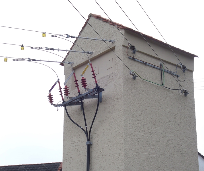 dienenden langen,grauen Silikonisolatoren jüngster Generation am Mittelspannungszugang (Abb. rechts unten).