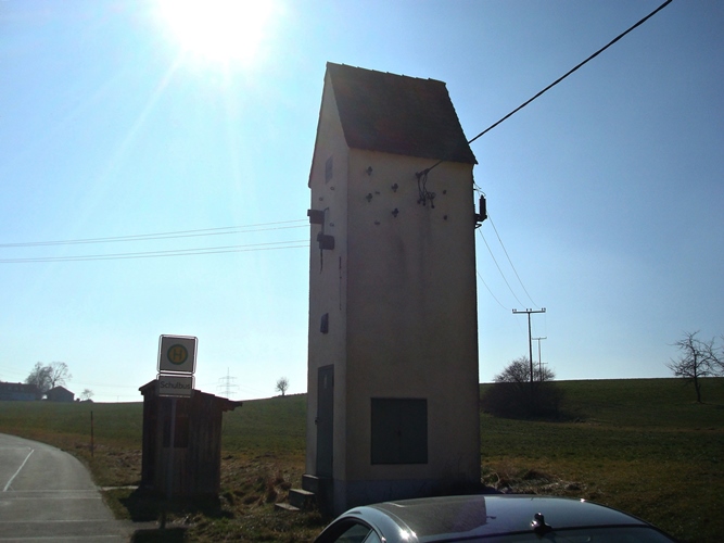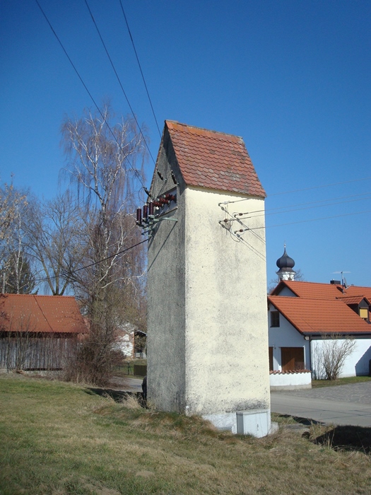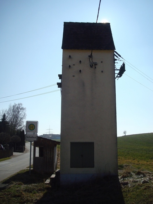 Die Turmstation steht in der Grundner Straße in Unterschwillach, direkt neben der Bushaltestelle, wo der Schulbus hält. Der Trafo ist noch im Freileitungsnetz in Betrieb und versorgt anscheinend den gesamten Weiler.