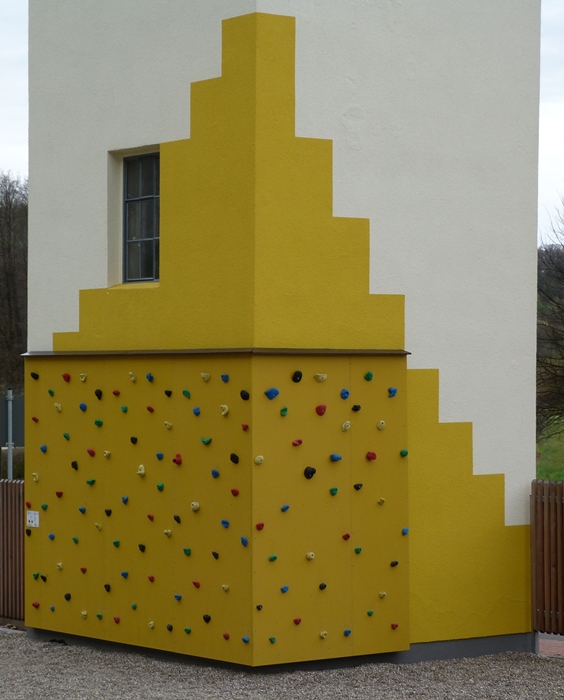 An zwei Fassaden des Turms wurden von der Fa. OnTop Klettern GmbH Kletterwände eingerichtet, die laut Anschlag (siehe Bild