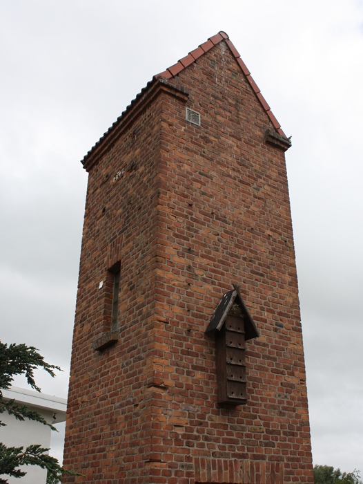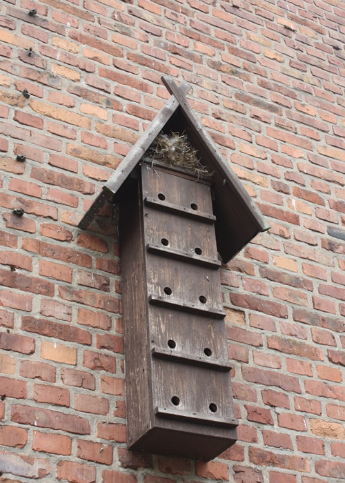 Jemand hat an der Turmfassade Nisthilfen aufgehängt, eine begrüßenswerte Maßnahme im Sinne des