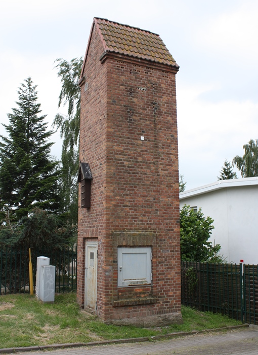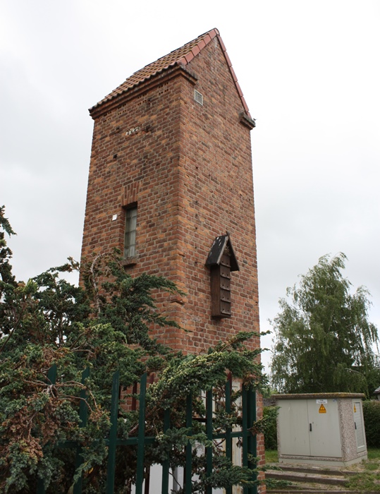 Der typisch norddeutsche Backsteinturm steht in Altentreptow gegenüber der Fritz-Peters-Straße 61