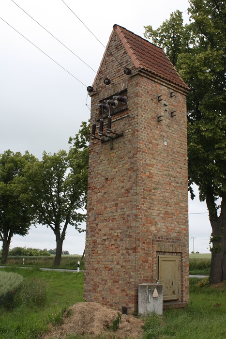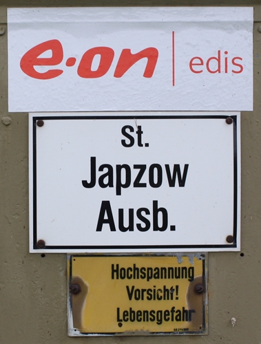 Die Trafostation Japzow Ausbau ("St. Japzow Ausb.") der e-on/edis steht in Japzow Ausbau an der L273, am Ortseingang rechts,