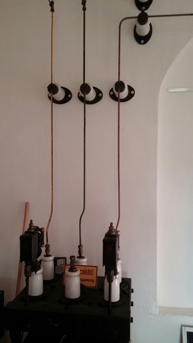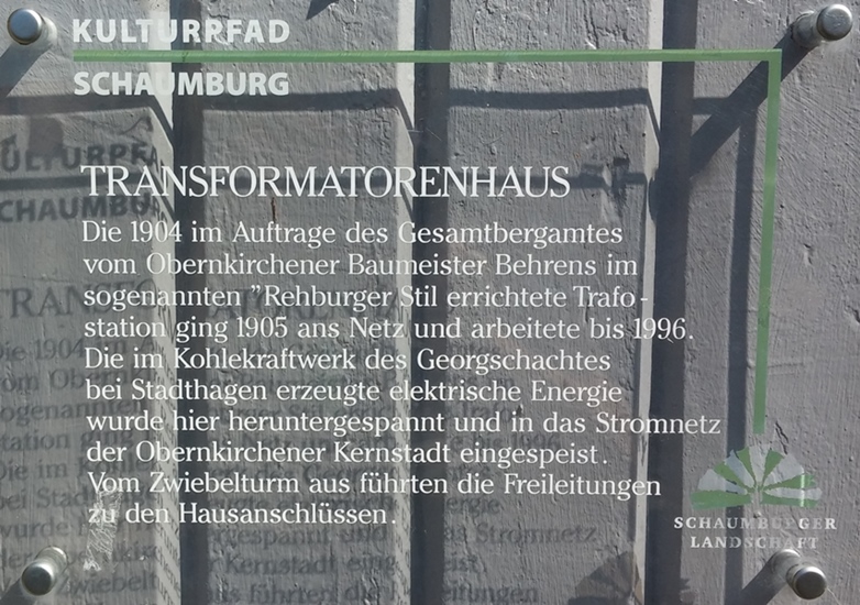 Diese Webseite wurde mit Stand Mai 2016 stillgelegt [ weiterlesen ] Zur Bergstadt Obernkirchen gehören auch die Ortschaften Gelldorf, Krainhagen, Röhrkasten und Vehlen. ![]() ![]() ![]() ![]() ![]() ![]() ![]() ![]() ![]() ![]() ![]() ![]() ![]() ![]() ![]() ![]() Das Trafohaus Obernkirchen am Kirchplatz von 1904 wurde zum Künstlercafé Fotos: Dirk Eimermacher, April 2015 und August 2015 (Innenaufnahmen) Dieses mit vielen verspielten Details im "Zuckerbäckerstil" ausgestattete Trafohäuschen des frühen 20. Jahrhunderts steht in der Bergstadt Obernkirchen am Kirchplatz. 1995 wurde es renoviert und erscheint heute wieder in seiner ursprünglichen Form. Alle drei Jahre verwandelt sich das Trafohaus im Rahmen des hier stattfindenden Bildhauersymposiums zum Künstlercafé. An der Tür gibt eine Infotafel des Heimatvereins Schaumburger Landschaft im Rahmen des Kulturpfads Schaumburg Auskunft über die Geschichte: "Die 1904 im Auftrage des Gesamtbergamtes vom Obernkirchener Baumeister H. Behrens im sogenannten "Rehburger Stil" errichtete Trafostation ging 1905 ans Netz und arbeitete bis 1996. Die im Kohlekraftwerk des Georgschachtes bei Stadthagen erzeugte elektrische Energie wurde hier heruntergespannt und in das Stromnetz der Obernkirchener Kernstadt eingespeist. Vom Zwiebelturm aus führten die Freileitungen zu den Hausanschlüssen." Auch im Begleitheft zur Sonderausstellung 1995/96 "90 Jahre Strom in Obernkirchen" wird H. Behrens als Baumeister der Trafostation genannt. In der Broschüre sind überdies zwei alte Fotos der Trafostation zu finden. Rehburg ist nicht weit von hier und hatte eine berühmte Bauschule. So ist der Einfluss der Rehburger Baumeisterfamilie Meßwarb unverkennbar. Andere Quellen schreiben das Trafohäuschen am Kirchplatz sogar den Architekten Meßwarb zu, so das Poster der "AG Spurensuche" des Vereins Schaumburger Landschaft, das in einem Artikel der Schaumburger Nachrichten am 27. Dezember 2012 vorgestellt wurde: "Der Schlauchturm der Feuerwehr in Rehburg, das Transformatorenhaus in Obernkirchen und das Transformatorenhaus in Müsingen (alles Meßwarbgebäude): Die drei Gebäude - und andere - sind auf dem Poster der "Schaumburger Landschaft" verewigt. Die Transformatorenhäuschen in Müsingen oder Obernkirchen kennt wohl jeder, der einmal an ihm vorbeigefahren ist. Nur Eingeweihten dürfte indes bekannt sein, dass die beiden Gebäude von der Baumeisterfamilie Meßwarb errichtet wurden, die von 1895 bis zum 1. Weltkrieg für viele Bauten im Schaumburger Land verantwortlich zeichnete. "Zu erkennen sind die Bauten beispielsweise an Putzflächen, dem Fachwerk und einem Sinn fürs Detail", erläutert Ulrich von Damaros, was das Schaffen der Architekten Wilhelm und Ernst Meßwarb ausgezeichnet hat. "Es sind bis in die Inneneinrichtung toll durchgeplante Gebäude." Während Wilhelm Meßwarb strukturiert vorgegangen ist, kann man die Arbeiten von Ernst Meßwarb fast schon künstlerisch nennen. Er habe einen Sinn für das Individuelle und für die Mythologie gehabt, sagt von Damaros. Kennzeichen des einst belächelten "Zuckerbäckerstils" sind die vielen Details (...)" Quelle: Artikel "Was verbindet Müsingen mit Wölpinghausen?" vom 27. Dezember 2012 in der Online-Ausgabe der Schaumburger Nachrichten Ob das Trafohäuschen am Obernkirchener Kirchplatz nun von Behrens oder Meßwarb konstruiert wurde: es gehört auf jeden Fall zu den schönsten und ältesten Trafostationen unserer Sammlung - ein Dokument der hochentwickelten Baukunst des frühen 20. Jahrhunderts. Es kommt immer öfter vor, dass stillgelegte und für die Stromversorgung überflüssig gewordene Turmstationen eine Umfunktionierung erfahren. Manche dienen heute als Wartehäuschen an Bushaltestellen, als Aussichtstürme, als Wohnung und einige wie das Trafohäuschen am Kirchplatz als Restaurant: Zum Bildhauersymposium Obernkirchen öffnet das Trafohäuschen seine Pforten und steht Künstlern und Kunstinteressierten als Café zur Verfügung. Die Fotos der untersten Bildreihe vom 25. August 2015 erlauben uns einen Einblick in das Gebäudeinnere. Hier gibt es auf Tafeln Informationen zur Obernkirchener und Schaumburger Geschichte zu sehen, wie z.B. über den Obernkirchener Sandstein, die De Heye-Glas Gesellschaft und den Schaumburger Bergbau. An den Wänden können allerhand elektrotechnische Armaturen und Utensilien von anno dunnemals bestaunt werden, teilweise original aus der Betriebszeit der Station, teilweise als Dekoration: Hier wurde eine Sammelschienenstruktur für den Mittelspannungsbereich nachempfunden, wobei hier von einer früheren Betriebsspannung von maximal 10 kV auszugehen ist, eher weniger. Die Porzellanstützer an der Wand sind eher aus den 1920er bis maximal 50er Jahren. 1904/5 gab es diese Form so noch nicht. Auf dem Bild ganz rechts der untersten Reihe ist an der Seitenwand ein Kabelendverschluss für ein ankommendes Mittelspannungskabel zu sehen. Die Anordnung der Drehspul- bzw. Dreheisenmesswerke am Ende der Sammelschieneninstallation ist lediglich aus dekorativen Gründen angebracht. In dieser Form wäre es technisch unsinnig. Auf der Gegenseite münden die drei Kupferschienen an die Endkontakte eines früher gebräuchlichen Ölkesselschalters, für Schaltvorgange unter Last (siehe mittleres Bild der untersten Reihe). Als dekorativer Nebeneffekt dient das Schienensystem heute noch der Versorgung der Halogenbeleuchtung im Raum, wird also mit 12 Volt betrieben. Auf dem Foto links unten ist neben den drei einpoligen Trennschaltern noch ein alter Messwandler für die Stromstärkemessung im Mittelspannungszweig als dekoratives Element angebracht. Wie es tatsächlich im Innern eines Trafoturms ausgesehen hat und teilweise noch heute aussieht, zeigen wir auf unserer Sonderseite Innenansichten von Turmstationen. Das 10. Internationale Obernkirchener Bildhauer Symposium (IOBS) fand vom 24. August bis 6. September 2015 unter dem Motto "Bildhauer bei der Arbeit" statt. Alle drei Jahre seit 1988 arbei