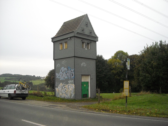 Der alte Stromturm steht in der Schwelmer Straße 149 (=L411) direkt an der Bushaltestelle Lusebusch.