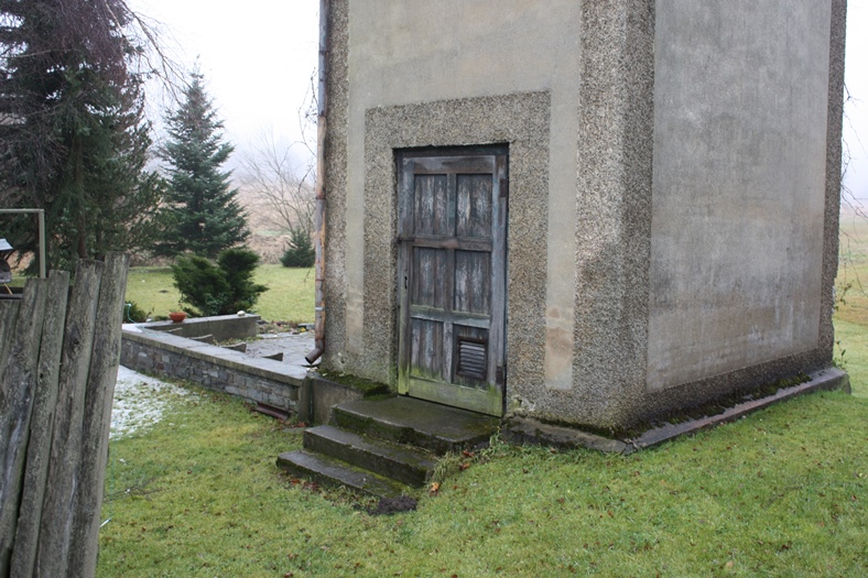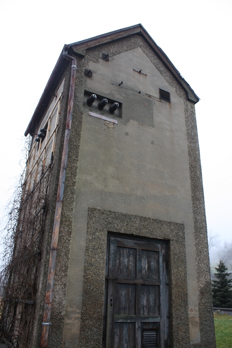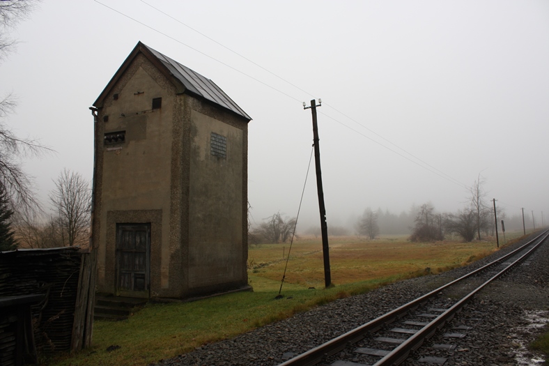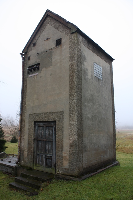 Zwischen Schmalspurbahn (siehe unten) und der tschechischen Landesgrenze steht das stillgelegte Trafohäuschen, das