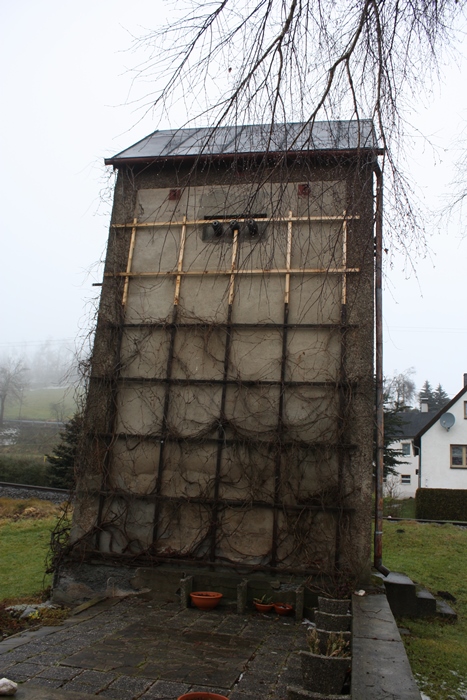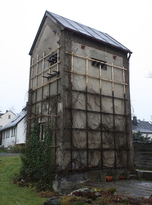dem Anschein nach heute privat genutzt wird. An Lattengestellen rankt Efeu empor. Eine emsige Gärtnerin oder ein emsiger