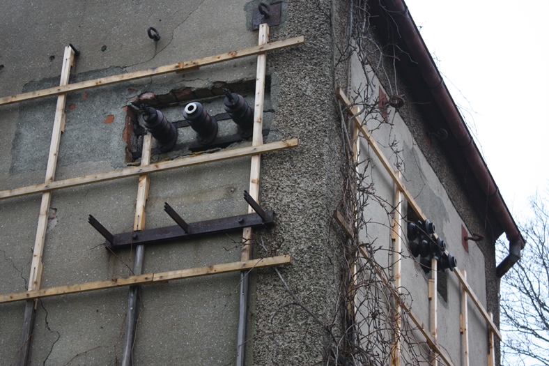 An drei Fassaden sind noch die Isolatoren der Wanddurchführungen vorhanden, durch die zur Betriebszeit der Station