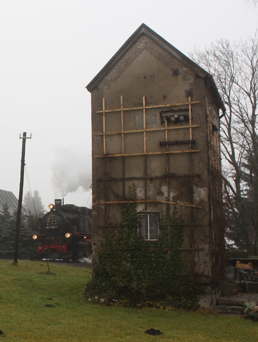 Der Trafoturm Hammerunterwiesenthal steht direkt am Gleis der Fichtelbergbahn (Schmalspurbahn Cranzahl-Oberwiesenthal), die