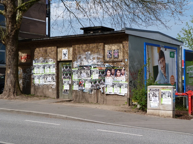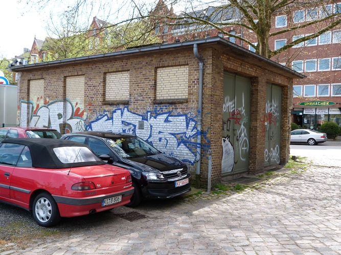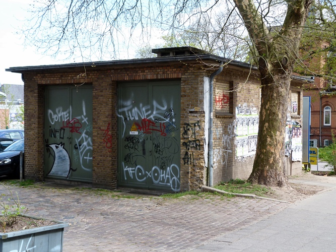 Diese urbane Trafostation steht neben Kirchhofallee 70, einem angenehmen, ruhigen und doch belebten Stadtteil von Kiel.