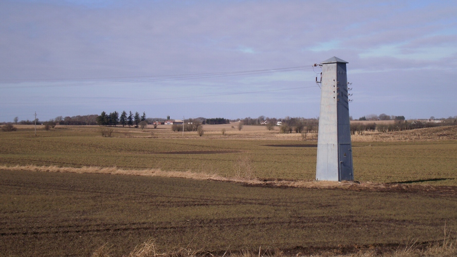 Der alte Backstein-Trafoturm und zwei Blechstationen am Nørreåvej bei Tjele