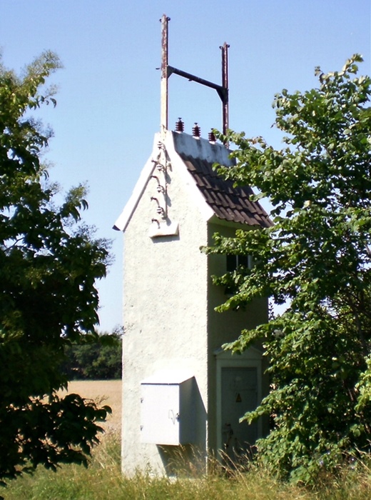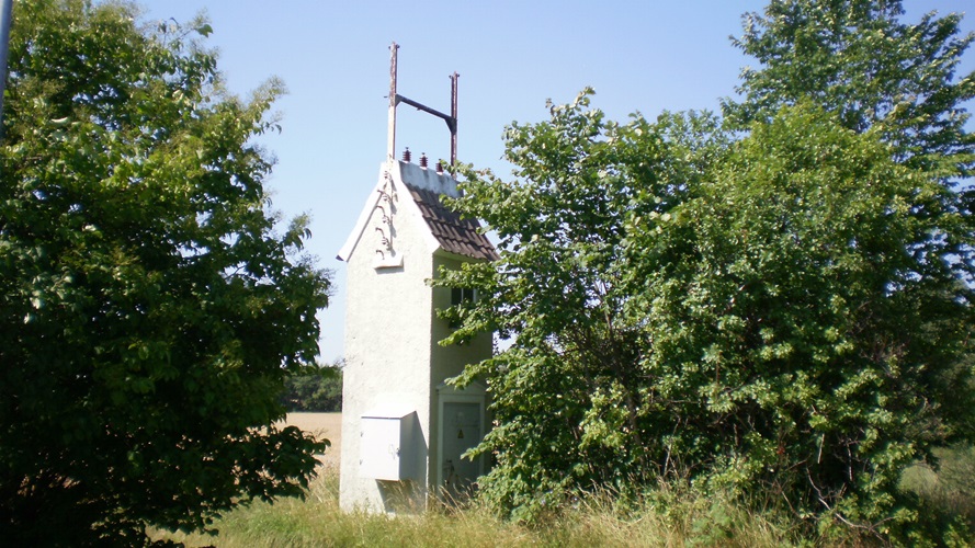 Freileitungen sind allerdings bereits abgebaut, hier wurde auf Erdverkabelung umgestellt. Auf dem Dachfirst ist noch der