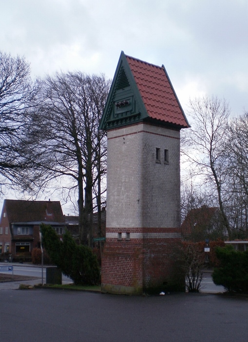 Das Mauerwerk im oberen Teil des Turms sieht nach Kalksandsteinen aus, es könnten auch Ziegel einer helleren Lehmsorte sein.