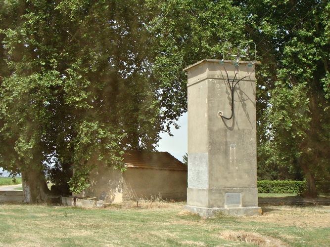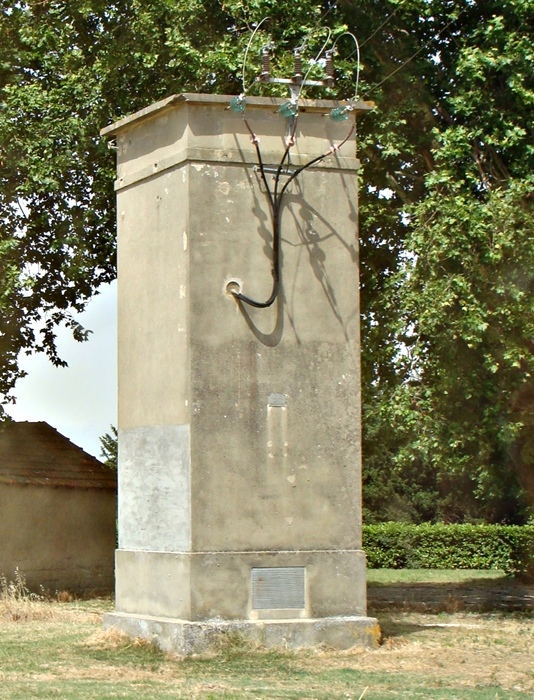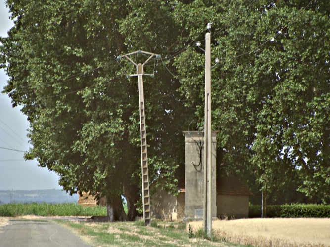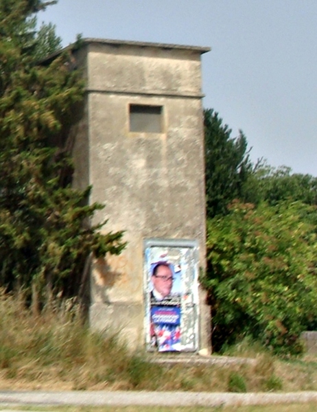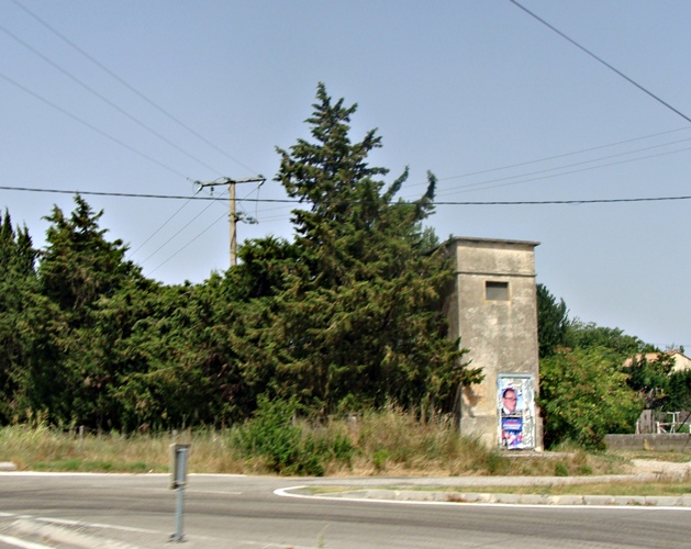 Der Trafoturm liegt etwas außerhalb von Arles. Es kleben noch Plakatreste vom Wahlkampf 2012, die u.a. auch