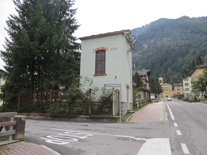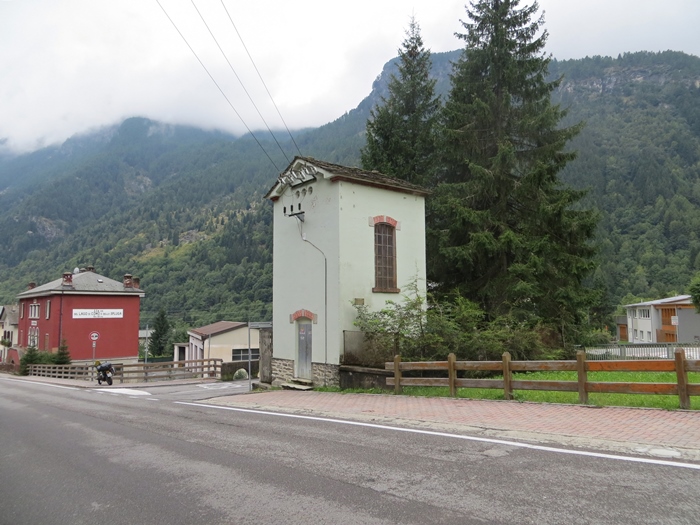 Seite durch die kleine Gemeinde Campodolcino. Dort steht an der SS36, Ecke Via Giavere, diese schöne alte Turmstation.