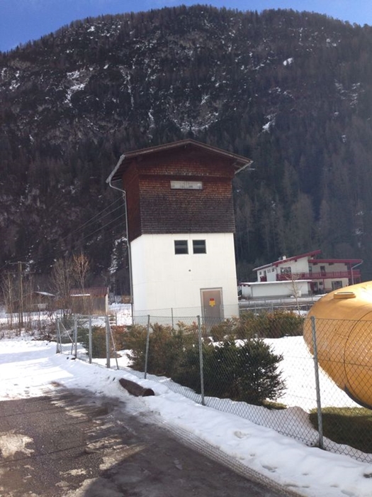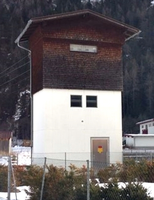Pittoresk steht die Turmstation mit ihrem holzschindelverkleideten Obergeschoss vor der Tiroler Bergkulisse. Der Trafo ist