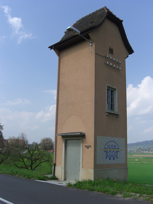 Bei diesem stillgelegten Turm fällt das schöne geschweifte Walmdach auf. Das Baujahr konnten wir nicht ermitteln,