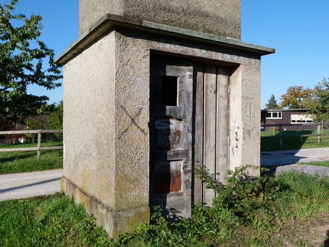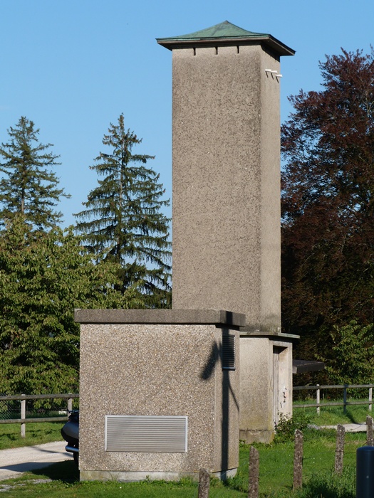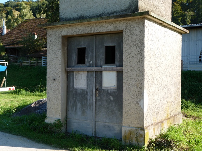 Die Umspannung hat eine modernere begehbare, fabrikfertige Netzstation neben dem alten Turm übernommen (mit abgebildet), an der auch ein Schweizer Warnschild der neueren Generation angebracht ist (Foto rechts unten). Mehr zu diesem Thema siehe auf unserer Themenseite Warntafeln. Weitere Einblicke in das Innere von Trafotürmen findest du unter Innenansichten von Turmstationen.