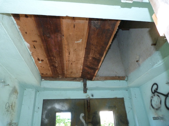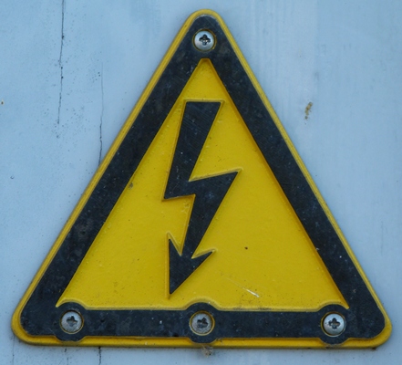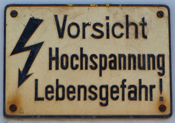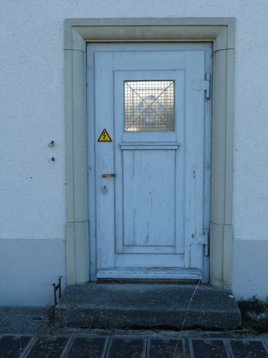 Das schlichte Warnschild an der Tür ist dreieckig und vermutlich neueren Datums (siehe hierzu auch unsere Themenseite Warntafeln).