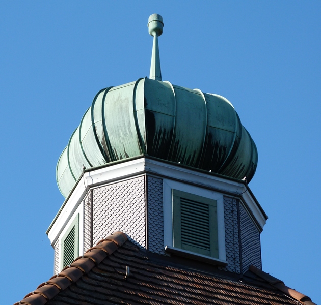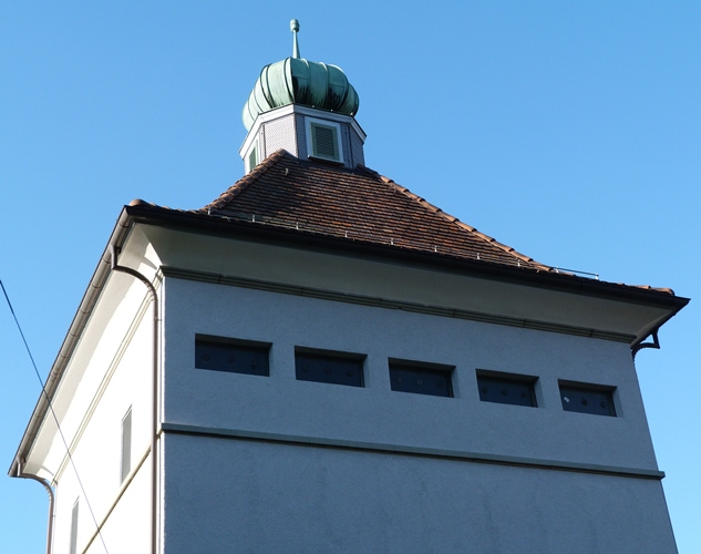 Der quadratische Turm mit Zeltdach ist mit einem achteckigen, geschindelten Türmchen mit Zwiebelhaube wie mit einem Kirchturm bekrönt. Die Trafostation wurde 1925 erbaut und steht als wertvolles Industriedenkmal unter Denkmalschutz. Die Fassaden sind verputzt und durch Gesimse gegliedert, die Eingangstür umrahmt ein profiliertes Steingewände.