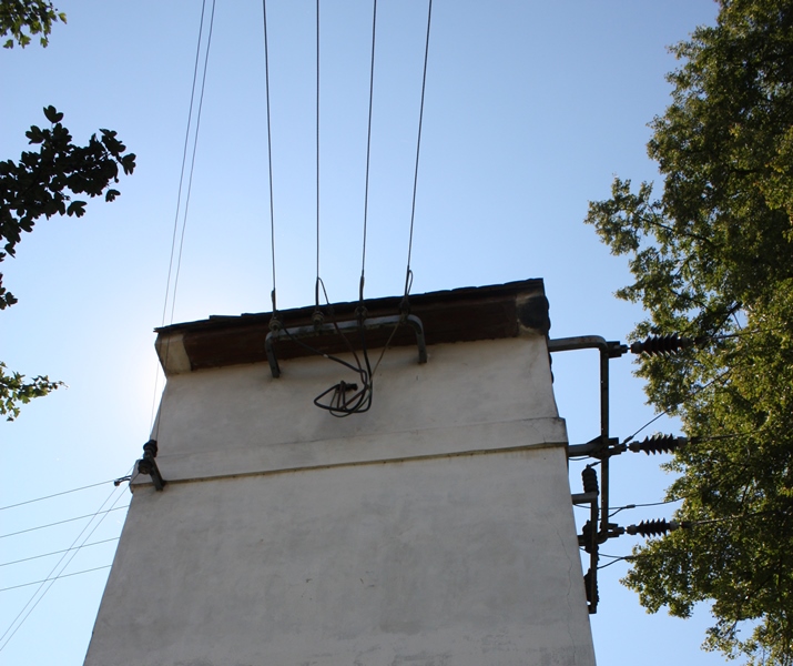 Die Trafostation ist offensichtlich noch in Betrieb und hängt mittel- und niederspannungsseitig am klassischen
