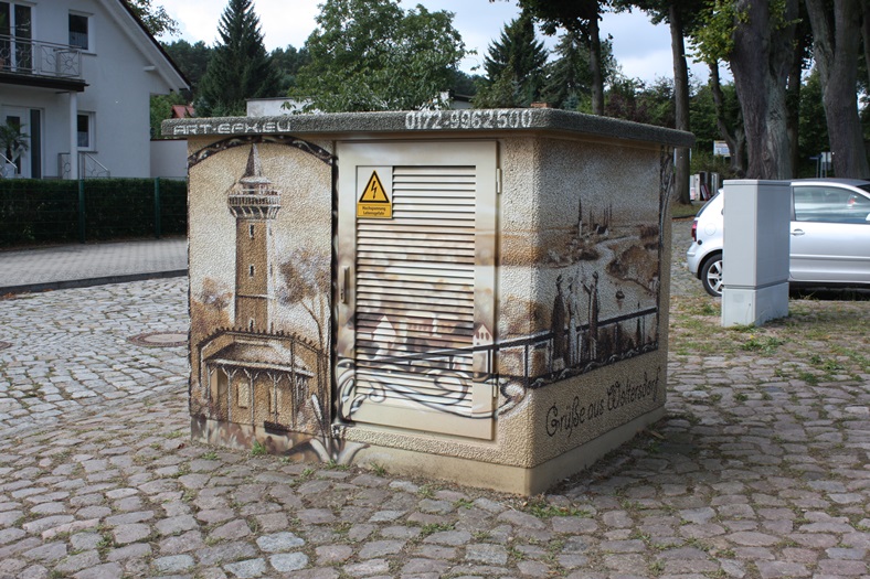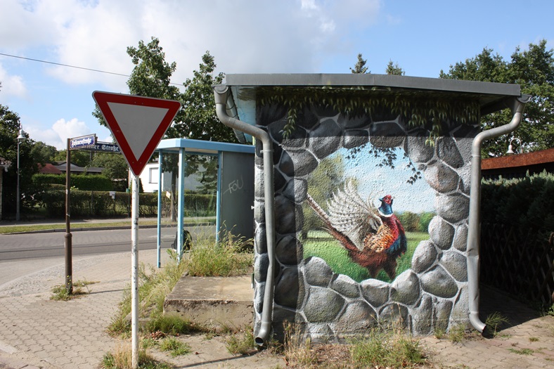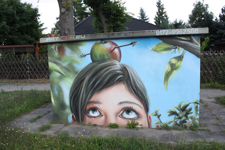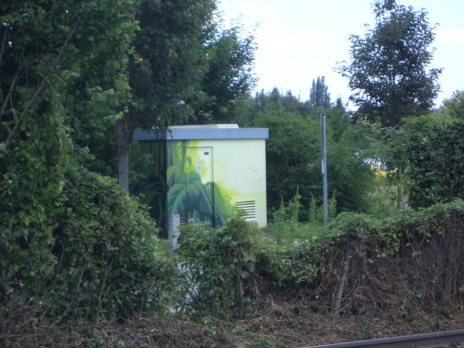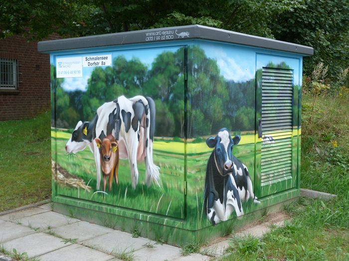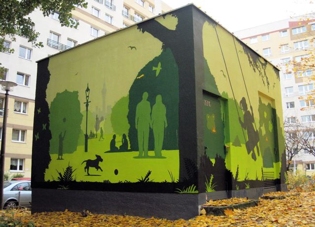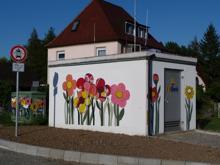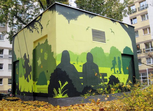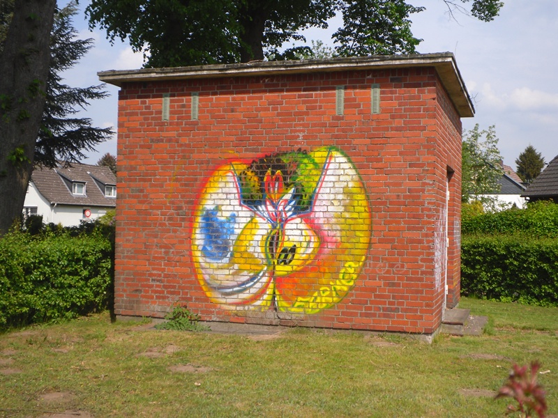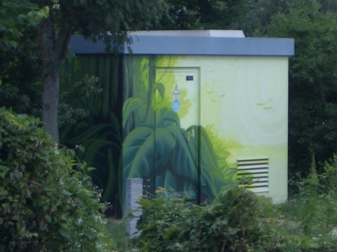 Diese Webseite wurde mit Stand Mai 2016 eingestellt [ weiterlesen ] Durch Gestaltung mit Wandmalerei - oft in Sprühtechnik/Graffiti - erfahren Trafohäuschen in mittlerweile vielen Fällen eine Aufwertung. Dies gilt für alte stillgelegte Trafohäuschen, die sonst vielleicht abgerissen worden wären, aber besonders für neuere industriell gefertigte Kabel-Fertigstationen, die noch in Betrieb sind und meistens als hässlich und gesichtslos empfunden werden. Der Bogen spannt sich von Kunst über Kitsch bis zu illegalen Graffitis. Eine künstlerische Bewertung der Werke überlassen wir gerne berufeneren Kritikern - ohne uns die spontane und völlig unwissenschaftliche Begeisterung für einzelne Arbeiten nehmen zu lassen. In einigen Fällen bedienen sich Künstler bei der Neugestaltung von Trafostationen der Illusionsmalerei oder Scheinarchitektur, auch Trompe-l'œil genannt ("täusche das Auge", von französisch tromper "täuschen" und l'œil "das Auge"). Illusionsmalerei spiegelt dem Betrachter das Vorhandensein baulicher Elemente und Einrichtungen vor, die real nicht existieren. Nachfolgend stellen wir einige Beispiele aus allen Bereichen vor: ![]() ![]() ![]() ![]() ![]() Der Trafoturm in Berg - "Fensterln" als Motiv der Illusionsmalerei Fotos: © Max Hergenröder, 16. Juni 2013 Der bayerischen Umgebung angemessen haben die Künstler das allseits bekannte Motiv des "Fensterlns" gewählt, eine Art der süddeutschen Brautwerbung, die in früheren sittenstrengen Zeiten oft die einzige Möglichkeit war, dem anderen Geschlecht näher zu kommen. Ein junger Bursche versucht der bereits wartenden Geliebten seine Aufwartung zu machen, indem er mit Hilfe einer Leiter zum Fenster hinaufsteigt, in der Hoffnung mitsamt der mitgebrachten Rose dort Einlass ins Schlafgemach zu finden. Die Fortsetzung der Geschichte sehen wir in der zweiten Szene an der rückwärtigen Fassade des Turms: Der erboste und auf die Keuschheit der Tochter bedachte Vater hat Lunte gerochen und hält auf dem Balkon Ausschau nach dem Eindringling, der sich mit letzter Kraft unten am Balkon festhält - die mitgebrachte Rose immer noch quer im Mund. Die Angebetete hält sich angesichts der verzweifelten Lage ihres Verehrers vor Schreck die Hände vor den Mund. Liebevoll ausgeführte Details faszinieren den Betrachter: Blumen an den Fenstern, aufgestapeltes Brennholz, die Katze beobachtet eine Maus - oder schnurrt sie? Typisch für Art-EFX ist auch die Einbeziehung von außen angebrachten Utensilien: Hier ist es ein Schaltkasten, der zu einem altertümlichen Briefkasten umgestaltet und in das Gesamtkunstwerk integriert wurde. Die Bezeichnung 'Illusionsmalerei' erhält hier sogar eine doppelte Bedeutung: einmal wird dem Betrachter durch künstlerische Technik das Vorhandensein baulicher Elemente (Türen, Fenster, Balkone...) vorgetäuscht, zum zweiten kann er eintauchen in die wohlige Illusion einer gemütlichen 'guten alten Zeit', die uns ein Stückchen heile Welt vorgaukelt, als 'alles noch besser' und 'die Welt noch in Ordnung' war. ![]() ![]() ![]() ![]() Die Trafostation Gnoien - Ein Meisterwerk der Illusionsmalerei Photos: © Benjamin Braune, Oktober 2012 ![]() ![]() vorher - nachher ![]() ![]() ![]() ![]() ![]() ![]() ![]() ![]() Das Trafohäuschen Oberteuringen als KunstRaum Turm Fotos: © Angela Schneider, Bruno Rauscher und Friedbert Kowalsky, 2012 ![]() ![]() ![]() ![]() Die Trafostation Überlingen Tulpenweg Photos: © Pit Fischer (Bilder links), 2012 und © Helga Sebecke (rechts), 2010 ![]() ![]() ![]() ![]() ![]() Die Trafostation Frickingen Austraße Photos: © Graf von Itty (Bilder links) und © Pit Fischer (rechts), 2012 ![]() ![]() ![]() Die Trafostation Schmidstraße, Berlin Mitte Fotos: © Frau Tonari, Oktober 2012 ![]() ![]() ![]() ![]() ![]() Die Transformatorenstation Nr. 522 Klinkertorplatz in Augsburg Graffiti-Projekt der Stadtwerke Augsburg bringt AEV- und FCA-Fans zusammen - und Spieler machen mit Fotos: © swa/Thomas Hosemann, 28. September 2013 ![]() ![]() ![]() Die Trafostation Mittlerer Graben in Augsburg Fotos: © Richard Molke, Mai 2013 ![]() ![]() ![]() ![]() ![]() ![]() ![]() Photos: © Pit Fischer, 2011 und 2012 Die Trafostation Überlingen Felderhaus: Ein Trafohäuschen als Bodensee-Ansichtskarte an Mutti, mit Vorder- und Rückseite, Briefmarke und allem Drum und Dran. Die Trafostation Überlingen Alte Nussdorfer Straße: Lasst Blumen sprechen! Flower Power in Pinseltechnik auf einer Betonfertigstation. Künstlerin: Helga Sebecke aus Überlingen-Nußdorf Die Trafostation Sassnitz Weddingstraße: Der Rabe Krax und die Maus Mimi werben farbenprächtig für das Nationalpark-Zentrum Königsstuhl auf der Insel Rügen. ![]() ![]() ![]() ![]() ![]() Photos v.l.n.r.: © Klaus Hänel 2013 (1+2), Michael Magnussen 2014 (3), Pit Fischer 2013/2012 (4+5) Die Trafostation Blankensee: Ländliche Idylle mit gackernden Hühnern vor einem vermeintlichen Heuschuppen auf einer Kabelstation in Brandenburg. Die Trafostation Siethen Jütchendorfer Straße: Wilde Tiere sehen dich an, auf einer Kompaktstation in Brandenburg. Die Trafostation Laboe an der Kieler Förde: Gans mit Sonnenbrille und U-Boot. Die Trafostation Pülsen: Idylle am Selenter See in der Probstei, Schleswig-Holstein. Die Trafostation Neuhaus Markt: Störche in der Elbtalaue, Niedersachsen. ![]() ![]() ![]() ![]() Photos v.l.n.r.: © Pit Fischer 2012/2013/2015, Manfred Kühl 2014 Die Trafostation Surendorf: Maritime Motive der Ostseesteilküste. Die Trafostation Katharinenhof: Bäuerliche Motive von anno dazumal auf der Insel Fehmarn. Die Trafostation Schmalensee: Landwirtschaftsmotive im Kreis Segeberg, Schleswig-Holstein Die Trafostation Babelsberg Fontanestraße: Wildschweine, Fuchs, Eichhörnchen und Buchfink an der Straßenbahnhaltestelle. ![]() ![]() ![]() Fotos: © Artenschutz in Franken 2013/2014/2015 Trafostation Walsdorf: Mehlschwalben und Fledermäuse in Oberfranken Trafostation Vierzehnheiligen: Vögel, Fledermäuse und Insekten in Oberfran