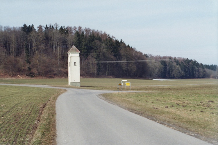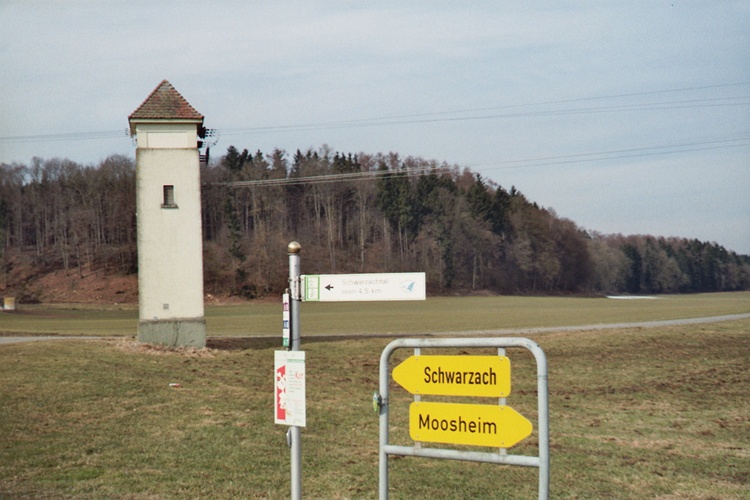 Schwarzach mit ihren sieben Mühlen. Nachdem die letzten Häuser passiert sind, taucht das Türmchen bereits am