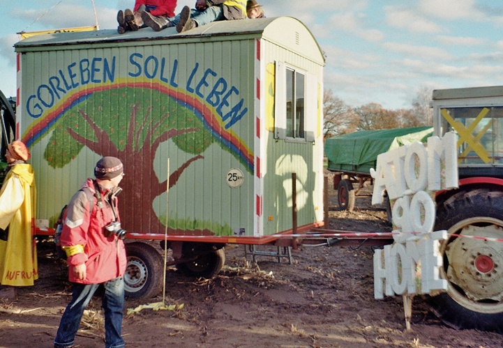 Diese Webseite wurde mit Stand Mai 2016 stillgelegt [ weiterlesen ] Zur Gemeinde Gorleben gehört auch das Dorf Meetschow. ![]() ![]() ![]() Ortsschild Gorleben, Trecker mit Anhänger, Plakat der Bäuerlichen Notgemeinschaft ![]() ![]() Das Trafohäuschen Gorleben - Treffpunkt und Symbol des Widerstands Abgerissen trotz Kaufangebot der Bürgerinitiative Lüchow-Dannenberg Foto: Siegwardt Puerrhus, Sommer 1994 (rechts eine Ausschnittsvergrößerung) Gorleben ist kein Dorf wie jedes andere, wie die Fotos ganz oben zeigen: hier wird gegen den jahrzehntelangen zähen Widerstand der Bevölkerung das deutsche Endlager für hochradioaktiven Atommüll im Salzstock Gorleben (sog. "Erkundungsbergwerk") gebaut. Ein oberirdisches "Zwischen"lager für Castoren ist bereits in Betrieb. Folgerichtig ist auch das Gorlebener Trafohäuschen kein Trafohäuschen wie jedes andere. Die typisch norddeutsche Backstein-Turmstation rechts vom Salinas-Gelände, an der Straße zwischen Endlager und Zwischenlager, diente der antiatomaren Widerstandsbewegung viele Jahre lang als Ausgangspunkt für Aktionen und Demonstrationen. Der "Treffpunkt Trafohäuschen" war legendär. Auf dem Foto ist eine Straßensperre zum Endlager zu sehen. Im Februar 2002 stand das Türmchen noch, danach wurde es irgendwann abgerissen. Das genaue Abrissjahr ist uns leider nicht bekannt. Als der geplante Abriss im Jahr 2000 bekannt wurde, wollte die Bürgerinitiative Lüchow-Dannenberg "das" Trafohäuschen sogar vom Stromversorger Avacon kaufen. Die Avacon lehnte einen Verkauf ohne Begründung ab: Endstation Abriss (siehe hierzu auch unseren Trafo-Friedhof). Ungefähr am Standort des Trafohäuschens begann im Hochsommer 1975 der Waldbrand, bei dem ein riesiges Waldgelände abbrannte - zum großen Teil im Besitz des Grafen von Bernstorff, der später zu einem engagierten Gegner des Atommüll-Endlagers wurde. Dabei handelte es sich bezeichnenderweise genau um das Gelände, auf dem der "Nuklearentsorgungspark" entstehen sollte. 1977, zwei Jahre nach dem Waldbrand, wurde die Standortentscheidung für Gorleben bekanntgegeben. Die Brandursache war Brandstiftung, die Brandstifter wurden jedoch nie gefasst. Eine durch den Brand entstandene Lichtung wurde 1980 von Mitgliedern der Anti-Atomkraft-Bewegung besetzt, die dort die Republik Freies Wendland ausriefen. "Im Landkreis ist das Trafohäuschen am Zwischenlager seit der Standortbenennung von Gorleben als Treffpunkt der örtlichen Anti-Atombewegung bekannt. Es hat im Laufe der Jahre seine Bekanntheit weit über die Grenzen des Landkreises ausgedehnt und wurde immer wieder von Atomkraftgegnern als Untergrund für kunstvolle Bilder genutzt. "Das Gebäude war für uns nie ein einfacher Treffpunkt. Es ist seit Jahren Symbol unseres Widerstandes, weil wir in seinem Schatten unsere Aktionen durchführten", so die BI-Vorsitzende Susanne Kamien. Die Bürgerinitiative versucht im Rahmen der Absprachen zwischen dem Landkreis und der Avacon das Haus zu übernehmen. Die Avacon lehnte bisher das Angebot der Bürgerinitiative ab und hat den Abbruch des Hauses angekündigt. "Wer Symbole zerstört, versucht auch die Idee zu zerstören." gab auf der Mitgliederversammlung der BI bereits Susanne von Immhoff zu bedenken. Seit die Nachricht öffentlich wurde, haben viele Menschen aus dem Landkreis im Büro der BI angerufen und sich erkundigt, ob es sich hierbei um einen schlechten April-Scherz handele. "Wir haben den Besitzer noch einmal um ein Gespräch gebeten und hoffen weiter auf eine gütliche Einigung. Die Avacon hat uns bisher keinen Grund für ihre Entscheidung genannt, der Abriss wäre eine reine Provokation, auf die wir natürlich reagieren würden." stellt Torsten Koopmann fest. Am heutigen Freitag will die BI auf dem Strukturtreffen um 20.00 Uhr in den Trebeler Bauernstuben mit den anderen Widerstandsgruppen beraten, wie der Turm gerettet werden kann. "Wir haben uns bereits mit unseren Anwälten über juristische Schritte beraten, und heute abend legen wir unser weiteres Vorgehen fest." Quelle: Pressemitteilung der Bürgerinitiative Lüchow-Dannenberg e.V. vom 06.04.2000 "Entstanden war die ca. 16 qkm große Brachfläche zwischen Gorleben und Trebel bei einem Großbrand im Jahre 1975. Niemand war vor der Standortbenennung (Februar 1977) auf die Idee gekommen, dass dieser Brand, eindeutig durch Brandstiftung verursacht, womöglich ein Hinweis auf eventuelle Großpläne einer Landesregierung sein könnte. Es dauerte Jahre, bis Umweltgruppen feststellten, dass zeitnah zu dem Brand bei Trebel mehrere andere große Waldflächen abgebrannt waren - allesamt offensichtlich durch Brandstiftung verursacht. Seltsamerweise ereigneten sich die Waldbrände alle auf Flächen, die als Standorte für mögliche Atomkraftwerke bzw. das nukleare Entsorgungszentrum im Gespräch waren. Aber bis heute blieb es im Dunkeln, wer und in wessen Auftrag die Brände gelegt hat. Für die Baupläne in Gorleben war es jedenfalls extrem günstig, dass die Waldflächen abgebrannt waren. So konnten die Waldeigentümer einfacher zum Verkauf bewegt werden." Quelle: wendland.net, Zeitzeugen: Gorleben wird als Atommüll-Standort benannt "1975 brannte unser Wald, mehrere hundert Hektar", erinnert sich Andreas von Bernstorff. Es waren die Hektar über dem Salzstock, inzwischen sei bewiesen, dass es Brandstiftung war. "Aber wer das Feuer gelegt hatte, wurde nie geklärt." Jedenfalls war es fast wertloses Land, für das die Regierung dem Grafen 1977 den überhöhten Preis von 30 Millionen D-Mark bot. Andreas von Bernstorff sagte Nein. Ihm wurde mit Enteignung gedroht. Er sagte Nein. Gorleben ist verbrannte Erde, von Anfang an." Quelle: Süddeutsche Zeitung, 10. Januar 2013, S. 3 Da wir bisher nur ein einziges Bild des Gorlebener Trafohäuschens haben: Wer kann uns noch mehr Fotos schicken, vielleicht auch Fotos vom Abriss? Gerne würden wir auch das genaue Abrissdatum (oder wenigstens Jahr) des Turms erfahren und unsere kleine Dokumentation mit weiteren
